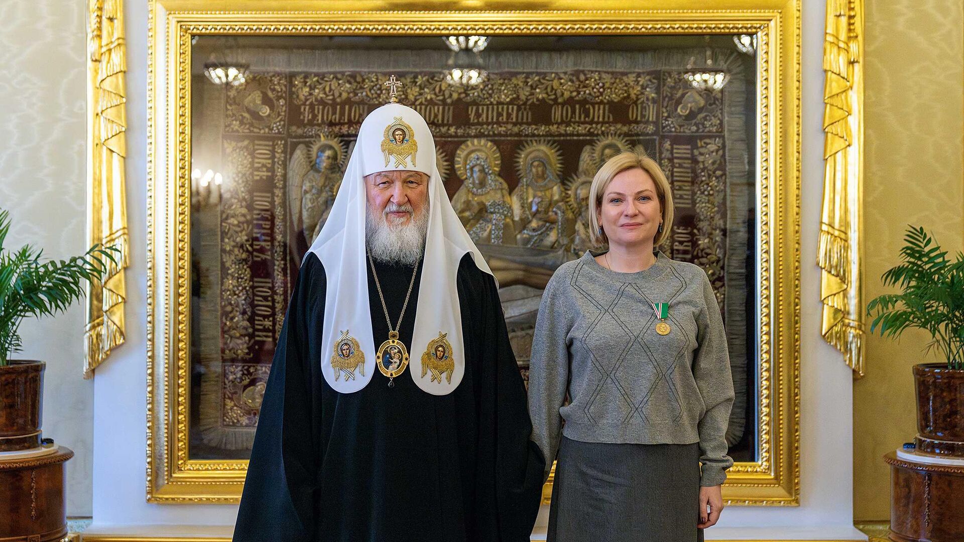 Патриарх Московский и всея Руси Кирилл вручил министру культуры РФ Ольге Любимовой медаль «Патриаршая благодарность» за значительный вклад в развитие церковно-государственных отношений, сообщает сайт Русской православной церкви (РПЦ).